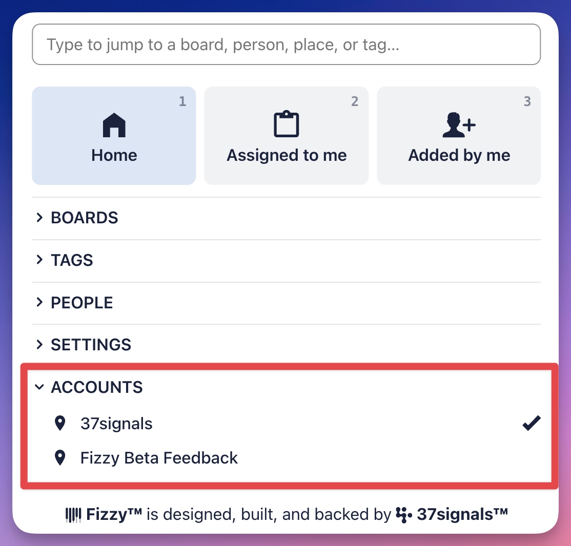 If you're working in multiple Fizzy accounts, you'll see an Accounts section at the bottom of the menu. Click to expand the section, then select the account you want to switch to.