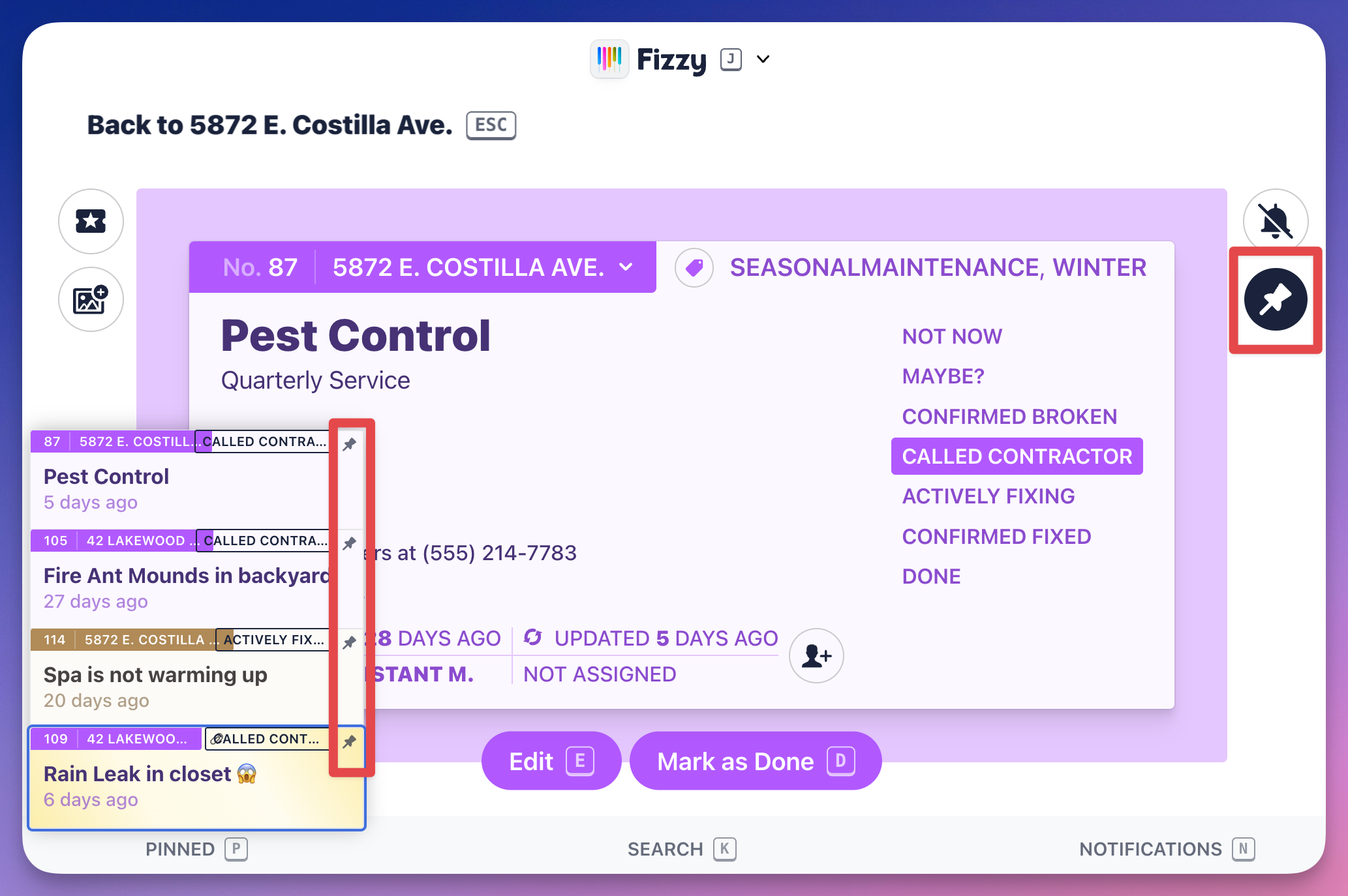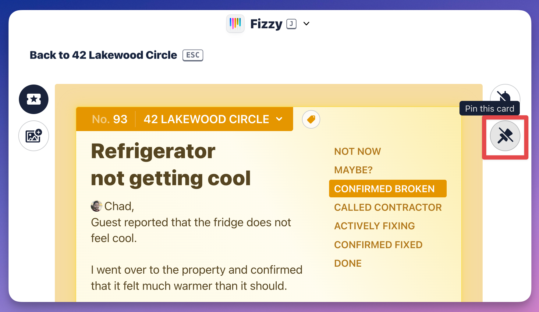 Access your important cards by pinning them. Click the "pin" icon on any card and it'll move it to the Pin stack located on the bottom-left. You'll always see your pinned cards there no matter where you are in Fizzy.
