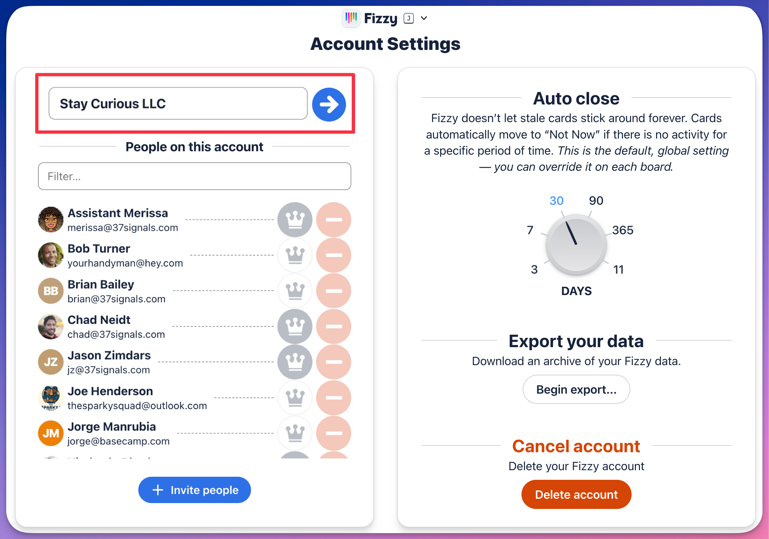 To get to the account settings page, open the Fizzy menu (J) and click the Account settings option located in the Settings section.