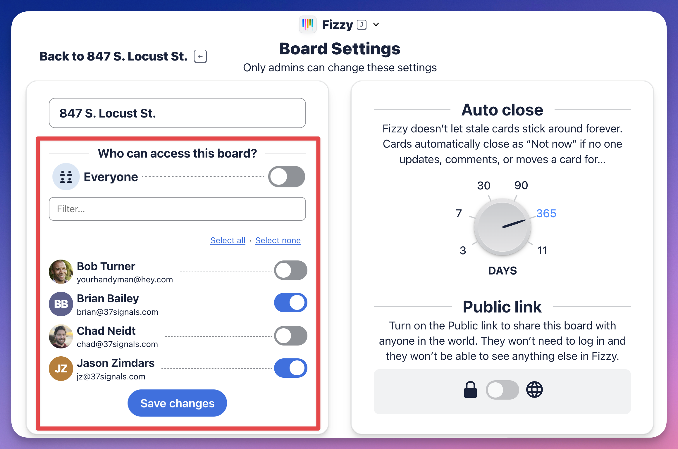If the Everyone option is turned on, click the toggle located directly to the right to turn it off. From there, you can choose who can see a board by clicking the toggles and clicking the Save changes button.