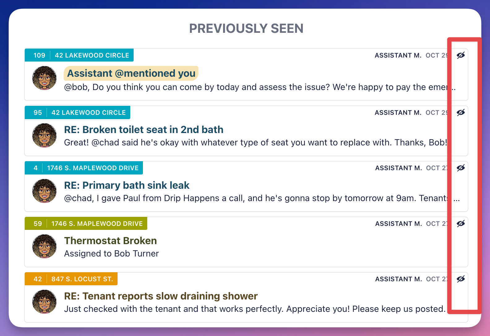 If you see some previously read notifications that you don't want to forget about, pop them into your notification stack by clicking the "unseen" icon next to the notifications you want to mark as unread.