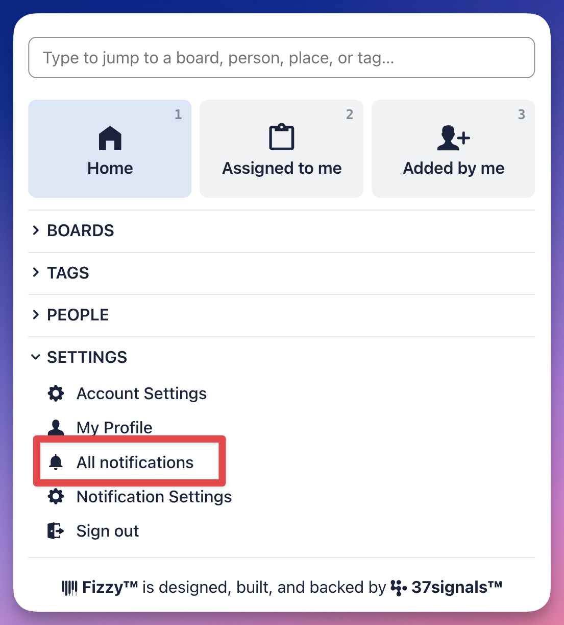 You can also access your notifications from the All notifications option in the Fizzy menu (J).