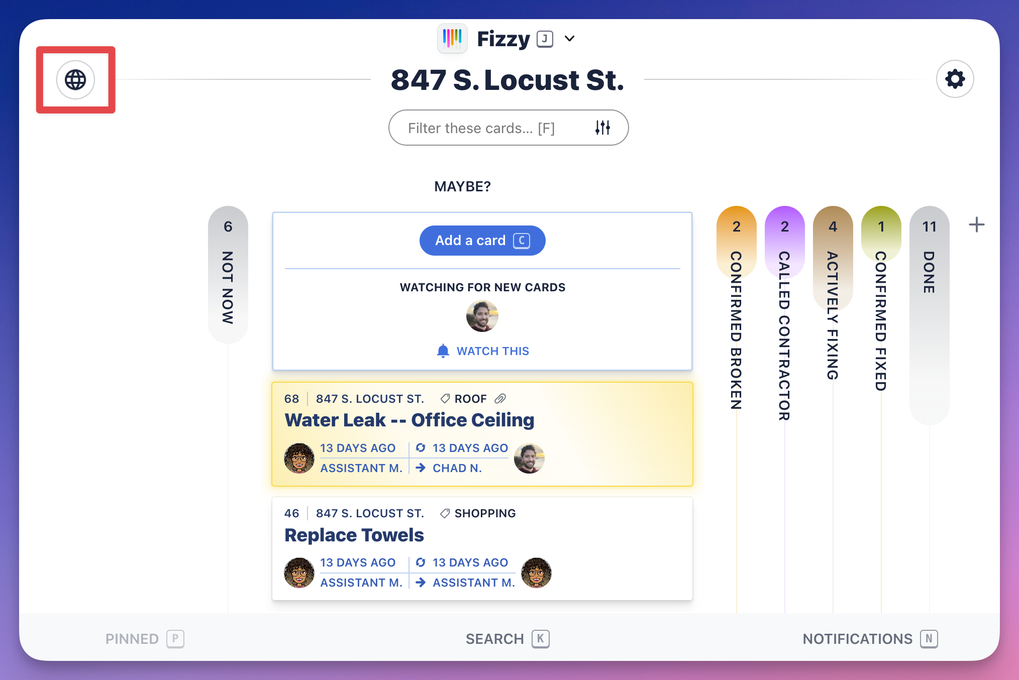 To create a webhook, you'll need to be an Administrator on the account. Click the "world" icon located on the top-left of a board and follow the instructions there.